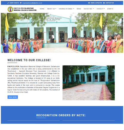 R.M.P.C.S.I.P.S.K. Rajaratnam Memorial College of Education, Sattankulam was established in the year 2006 and is being administered by the CSI Thoothukudi – Nazareth Diocesan Trust Association. It is affiliated to Tamilnadu Teachers Education University, Chennai with College Code No. 12608. -